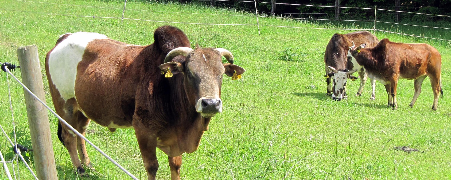 Gemeinsam mit den Ponys lassen wir die Rinder nicht auf die Weiden. Will man das probieren, raten andere Zebu-Halter, den kleinen Wiederkäuern Schlupflöcher zu lassen, wo die Pferde nicht durchpassen. So manches Ross entdeckt sonst spontan seinen „Cow Sense“ und spielt Cutting mit den Rindern. Wir schicken deshalb immer erst die Ponys, dann die Zebus auf eine Wiese, außer im Frühjahr, wenn alles schneller schießt als die Tiere fressen können. Aber auch da sind die Rinder gut, weil sie auch das lange Zeugs vertilgen. Außer Ampfer und den Lupinen, mit denen wir immer zu kämpfen haben, lassen die Zebus nichts stehen, die Weiden sehen aus wie gemäht wenn sie damit durch sind.