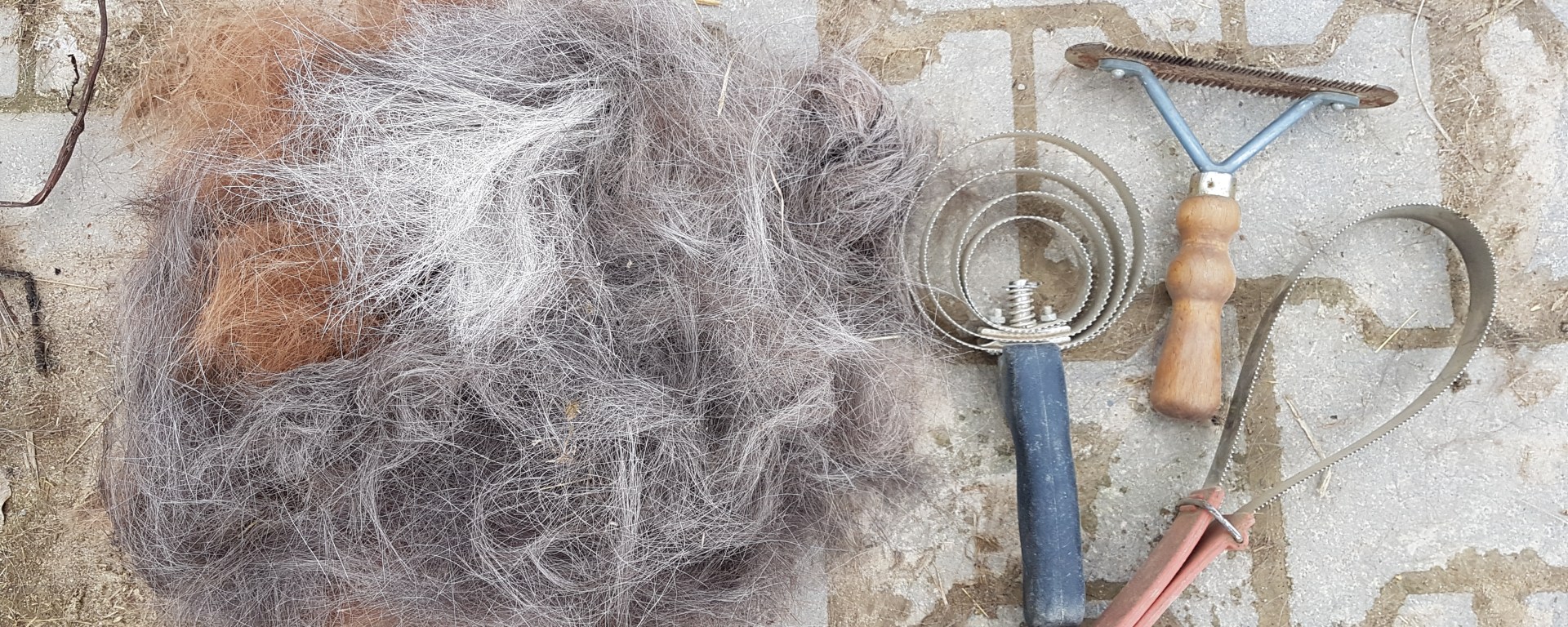 Bei langem Fell, etwa den Deckhaaren der Isis, hat sich der Fellkratzer (im Bild, Mitte) bewährt, ursprünglich mal erfunden für langhaarige Hunde – aber das Fell von einem Husky und einem Isi ist anscheinend recht ähnlich. Die langen Haare bleiben hängen, was auch den Vorteil hat, dass sie nicht überall herumfliegen. Kurzes Fell erwischt man damit nicht ganz so gut.