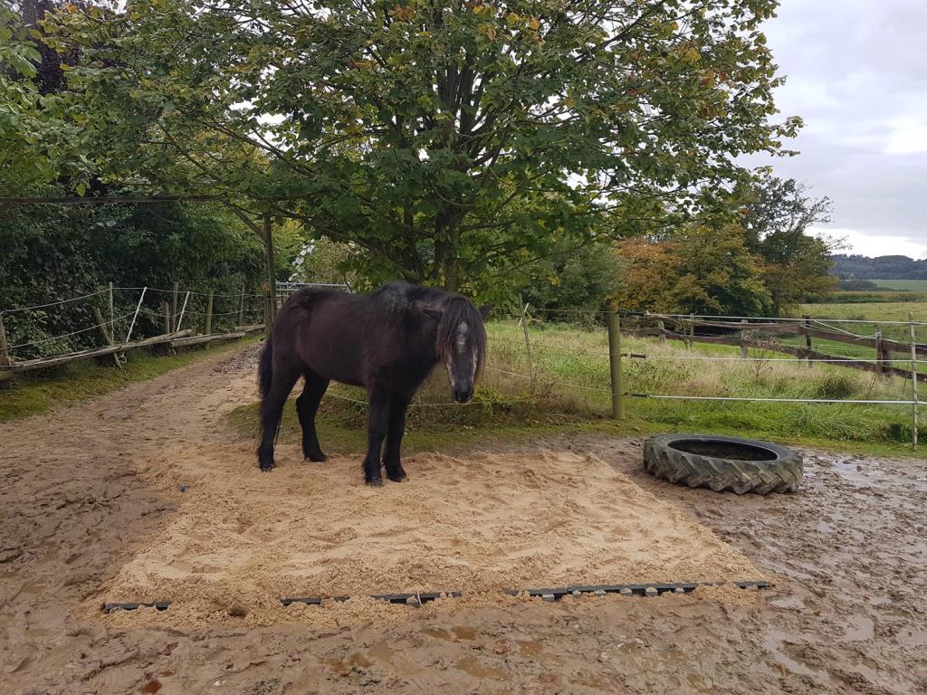 Zwei Wochen und sehr viel Regen später. Die Liegefläche ist weiterhin trocken, der Sand hat sich gesetzt, aber Schlamm gibt es dort nicht. Allerdings liegt da auch nie ein Pferd. Sie gehen da jetzt zum Pinkeln hin. Trotzdem sieht es nach wie vor recht ordentlich aus. Ich werde das einfach noch einmal an einer anderen Stelle versuchen, wo sie sonst auch gerne liegen. Der Boden hält jedenfalls.