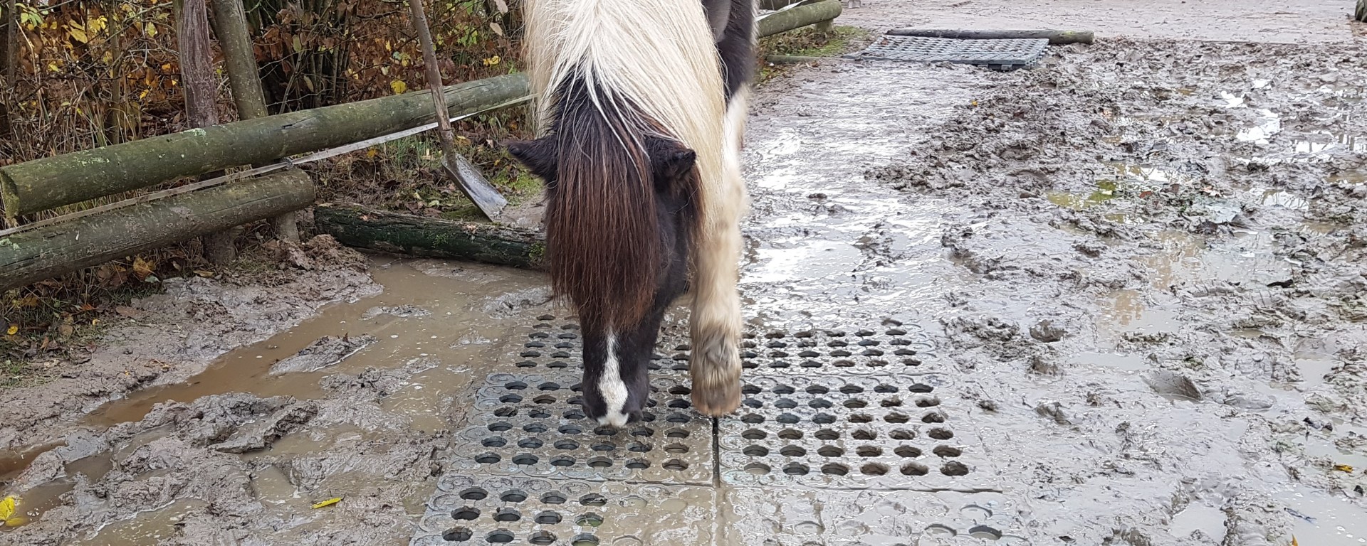 Empfohlen wird für einen schlammfreien Auslauf immer ein systematischer Aufbau: Tragschicht, meistens aus Schotter, eine Trennschicht, zum Beispiel Paddockplatten, und darauf eine Tretschicht, üblicherweise Sand. Aber dann sind da noch die Platten, die man laut Werbeversprechen ohne diesen Aufbau verlegen kann. Einfach in den Matsch, fertig. Geht das?