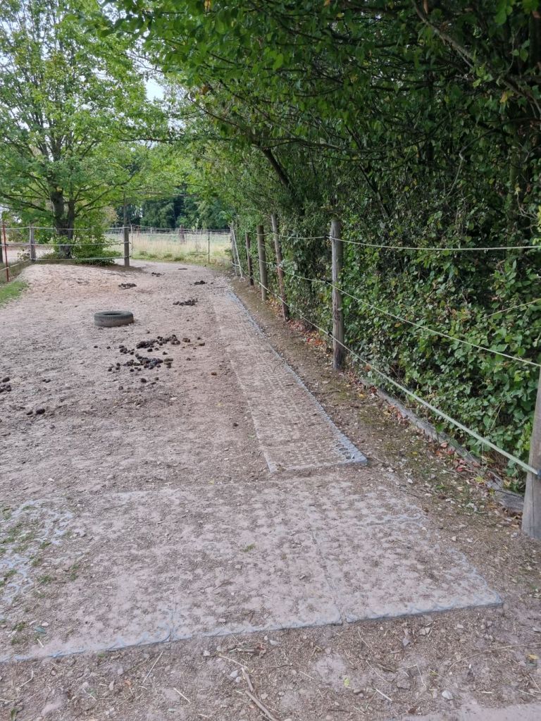 Also doch nochmal einen Weg aus Paddockplatten, diesemal nur eine Reihe, um die Mittelfuge zu vermeiden, und direkt am Zaun, wo es am festesten ist. Und dieser Weg hält auch ohne weiteren Unterbau jetzt richtig gut. Allerdings haben wir da die Platten auch nicht in so tiefen Modder gelegt, sondern vorher etwas Schlamm zusammengekratzt und fest werden lassen, so dass der Weg insgesamt etwas höher lag. Und dann hat sich die Verlegung als eine Reihe bewährt.