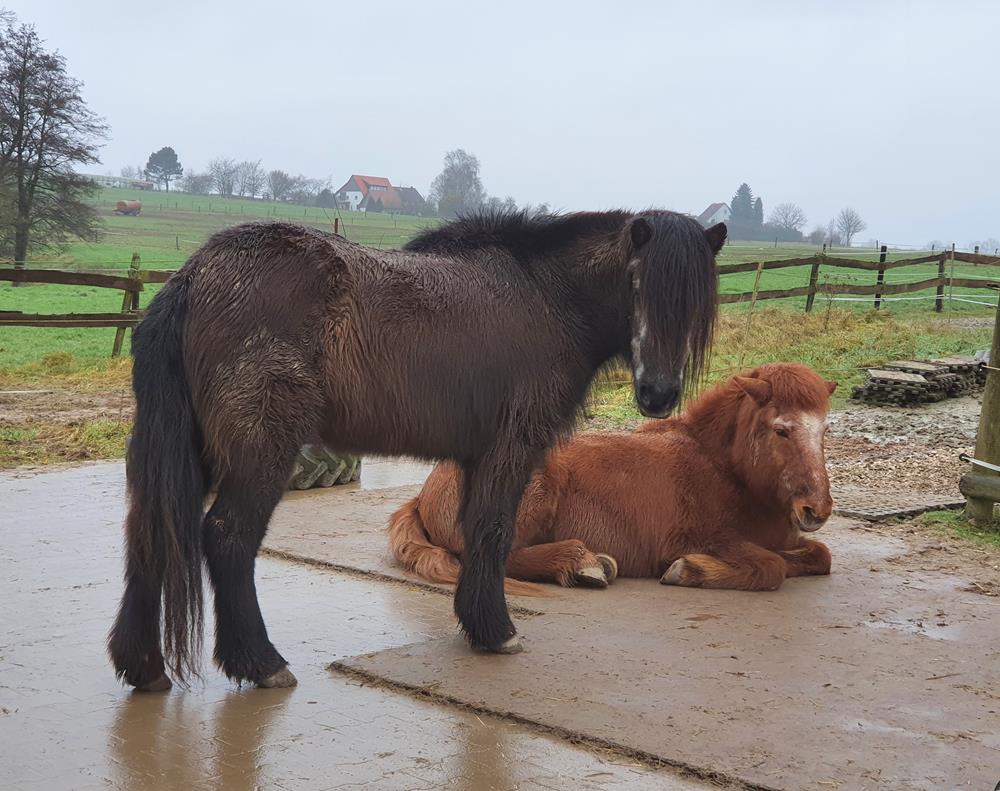 Das Ergebnis ist eindeutig: Ist der Trail offen, sind alle Pferde dreckig, das Siebgut kaum zerwühlt. Sie liegen dann auf dem viel härteren Lehmboden notfalls zwischen den Pfützen. Weil da die Aussicht besser ist. Selbst auf der Siebgutfläche liegen sie nie im Schutz der Hecke (die den Wind abhalten soll), sondern lieber in der hinteren Ecke wo der Sturm so richtig pfeift und der Regen waagerecht kommt. Aber wer weiß was in der Hecke hockt…