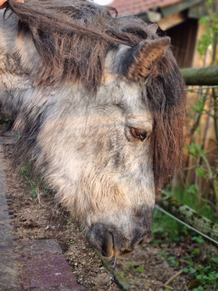 Am Dienstag nach Ostern stand sie zur Zeit der Mittagsfütterung schon im Stall. Ich freute mich, dachte, so langsam hat sie den Alltagstrott wieder drin. Seit dem Zwischenfall mit dem Festliegen mied sie den Stall eher und musste zu den Mahlzeiten reingeholt werden, damit sie im Stall abgetrennt fressen konnte. Sonst machten ihr die anderen die Heucobs streitig. Als ich später wiederkam, hatte sie leider wieder kaum gefressen. Sie hatte inzwischen sehr abgenommen. Und sie folgte Gandi nicht, als er aus dem Stall in den Auslauf ging. Aber das war es nicht, es war dieser Blick. Sie sah mich so müde und traurig an, dass ich wusste: Sie will nicht mehr. Irgendwie war es ganz deutlich. Und das sehen auch ihre Besitzerin und ihr Pflegemädchen, die ich dazuholte, weil ich die Entscheidung natürlich nicht allein treffen konnte und wollte.